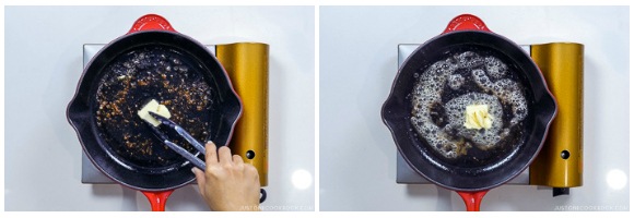 - Lower the heat to medium low, add 1½–2 Tbsp unsalted butter and swirl around.