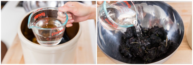- Open up the crock. Take out 1 cup of clear ume plum vinegar (umezu). Add it to the squeezed shiso in the bowl.