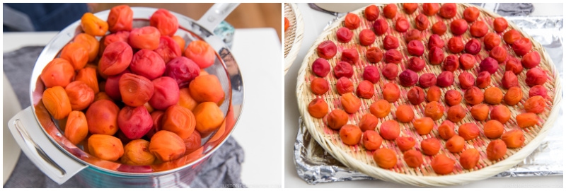 - The ume closer to the layer of shiso has a darker red color. Transfer the ume to a flat bamboo strainer, keeping some space between each of them. You will probably need 2 large strainers.