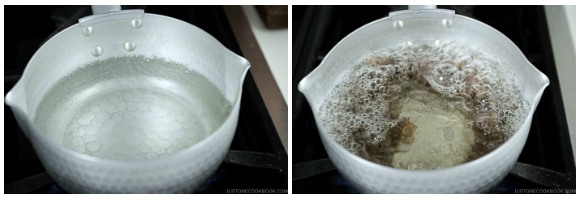 Now that you have clean tendons, it’s time to add flavors to them in dashi and seasonings. We give the tendons a head start so they have more time to absorb flavors before adding other ingredients.