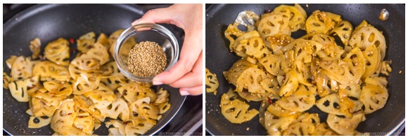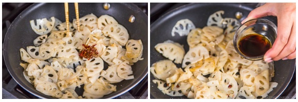 - Once the lotus root is almost translucent (80% cooked), add 1 Tbsp sake, 1 Tbsp mirin, and ½ Tbsp sugar. Let the alcohol evaporate (until there‘s no more alcohol smell).