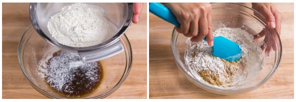 - Sift 1 cup cake flour and add to the brown sugar mixture. Combine the mixture with a silicone spatula, chopsticks, or your fingers. Pinch the clumps together into a ball. Cover with plastic wrap and set aside to rest the dough for 15 minutes in the bowl.