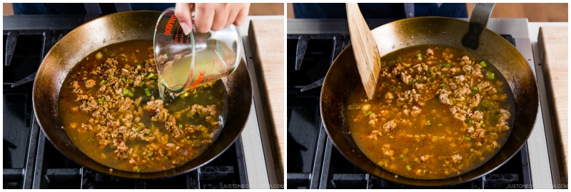 - Bring it to simmer and check the consistency of the sauce. If it‘s too loose, let the moisture evaporate. If the sauce is too thick, you can drizzle in a small amount of water to loosen it up. When the consistency is good, drizzle 2 tsp rice vinegar (unseasoned) over the sauce as a finishing touch.
