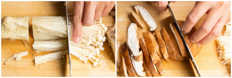 - Trim off the bottom of the enoki mushroom and cut it into 2-inch (5 cm) pieces. Discard the stem of shiitake mushrooms and thinly slice them.