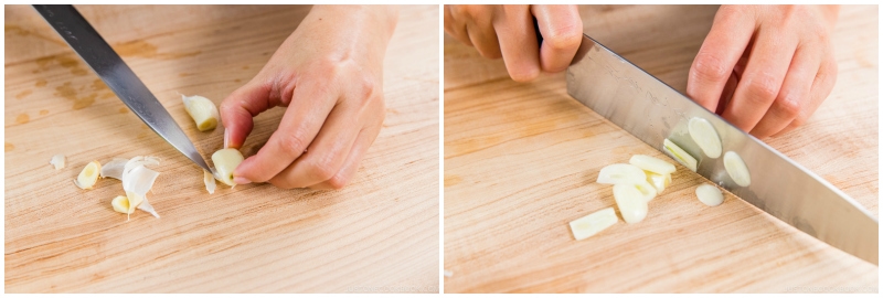 - Meanwhile, prepare the other ingredients. Peel 2 cloves garlic and thinly slice them.