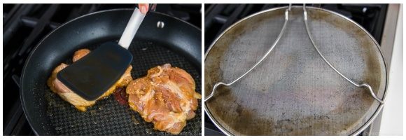 - Turn on the heat to medium low or medium. Slowly cook the chicken skin so the fat renders. DO NOT TOUCH the chicken pieces for the next 7 minutes, except to occasionally press down on them with a spatula. Do not cover with a lid; you can use a mesh splatter guard to avoid oil splatter, if desired.