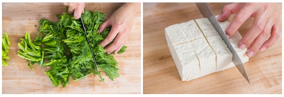 - Cut 1 bunch shungiku (chrysanthemum greens) into 2-inch pieces. Cut 14 oz medium-firm tofu (momen dofu) into large cubes.