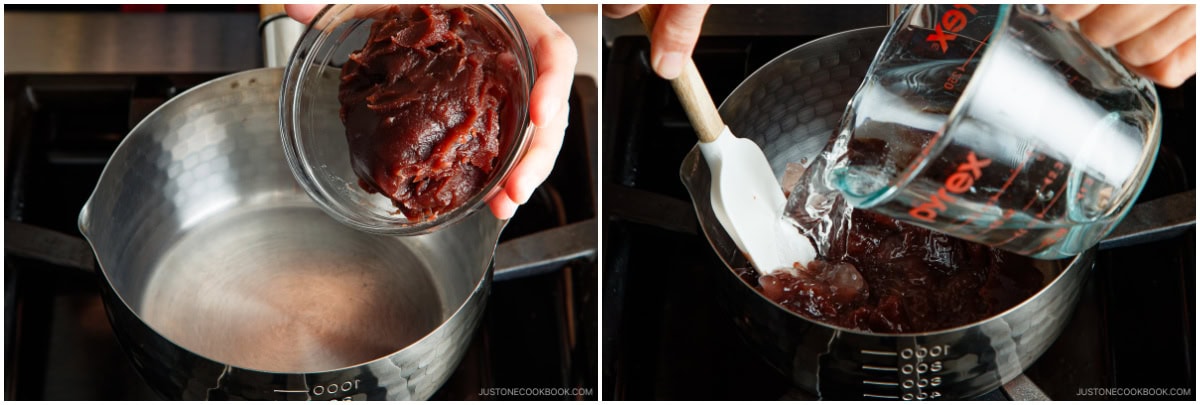 - Put 7 oz sweet red bean paste (anko) in a saucepan and add half of the water.
