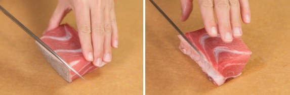 - Slice to desired thickness. Due to the high fat content, a thinner slice is recommended.