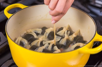 - Instead of stirring with utensils that can potentially break down the kombu, hold the pot and swirl it around to mix the seasonings and coat the food. Simmer with the otoshibuta in place for 15 minutes.