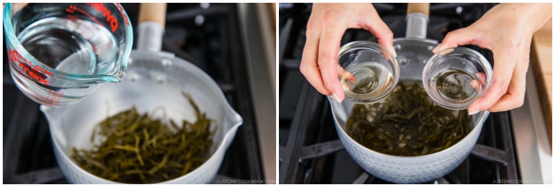 - Transfer the sliced kombu to a medium saucepan. Add 1 cup water, 1 Tbsp sake, and 1 Tbsp mirin.
