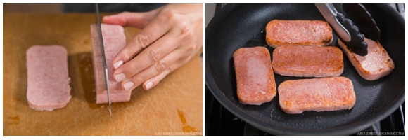 SPAM® product is usually cooked with soy sauce for musubi, so I season the SPAM® product the same way in this recipe. Soy sauce, mirin, and sake are the most important 3 ingredients for typical Japanese flavors.