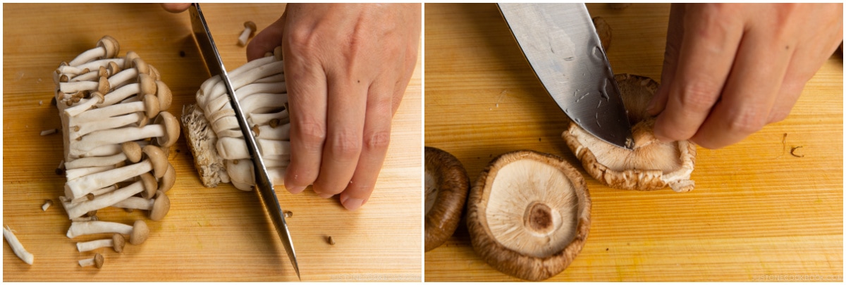 - Cut off and discard the root ends of 1 package shimeji (brown beech) mushrooms and the stems of 8 shiitake mushrooms.