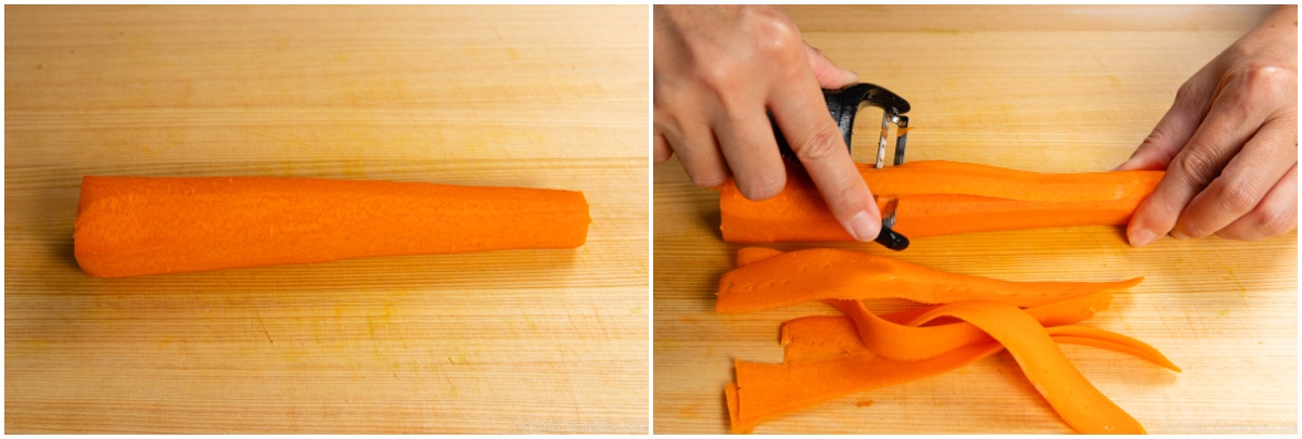 - Using the vegetable peeler, remove the outer skin of 1 carrot. Then, use the peeler to slice the carrot into superthin strips.
