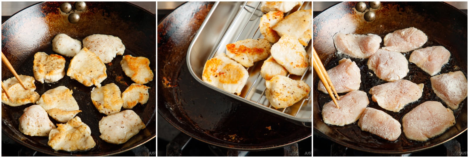 Preheat a large frying pan or carbon steel pan over medium heat. When it's hot, add 1 Tbsp toasted sesame oil. Add the chicken when the oil is hot, leaving space between the pieces. I cooked it in two batches. This allows the air to circulate so they sear nicely. Cover and cook for 3 minutes.