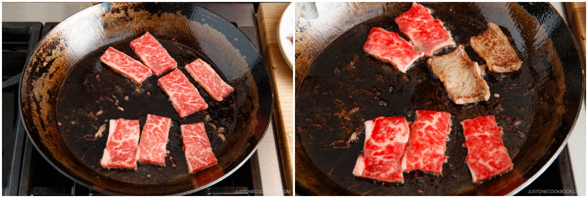- Preheat a large pan (I use a carbon steel pan) on medium heat. If your 10 oz boneless beef short ribs is well marbled, you do not need to grease the pan. When it‘s hot, add the first batch of beef slices in a single layer; leave some space between the pieces and do not overcrowd the cooking surface.